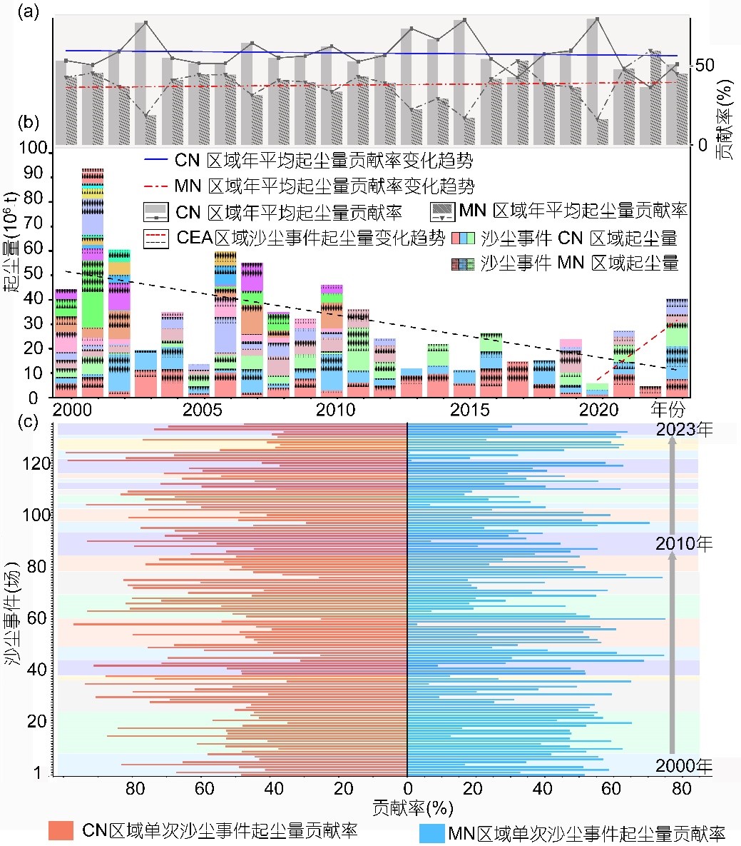 2000-2023年?yáng)|亞中部地區(qū)中國(guó)北方與蒙古國(guó)大規(guī)模沙塵事件起塵量及貢獻(xiàn)率變化