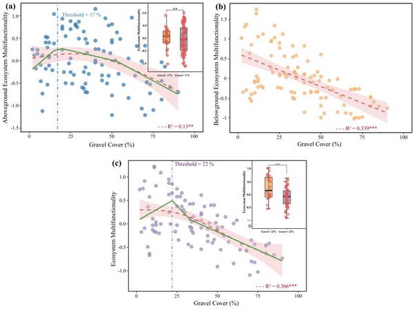 研究發(fā)現,隨著礫石覆蓋度的增加,草地植物物種豐富度、功能群組成及生物量顯著下降,尤其是地下生物量的減少最為明顯;土壤含水量、孔隙度及養(yǎng)分含量顯著降低,而容重顯著升高,導致生態(tài)系統(tǒng)整體功能衰退。礫石化不僅直接抑制植物生長,還通過削弱土壤養(yǎng)分供給間接降低生態(tài)系統(tǒng)多功能性。隨機森林與結構方程模型分析進一步揭示,土壤養(yǎng)分和植物多樣性是決定生態(tài)系統(tǒng)多功能性的關鍵調控因子。隨礫石化程度加劇,地上功能指數(AEMF)和地下功能指數(BEMF)均顯著下降,后者的響應更為敏感,當礫石覆蓋度超過22%時,生態(tài)系統(tǒng)多功能性(EMF)出現明顯突變性下降,表明該閾值可作為高寒草地退化的早期預警指標。研究指出,高寒草地礫石化退化過程會破壞植物-土壤耦合關系,導致生態(tài)功能的同步退化。