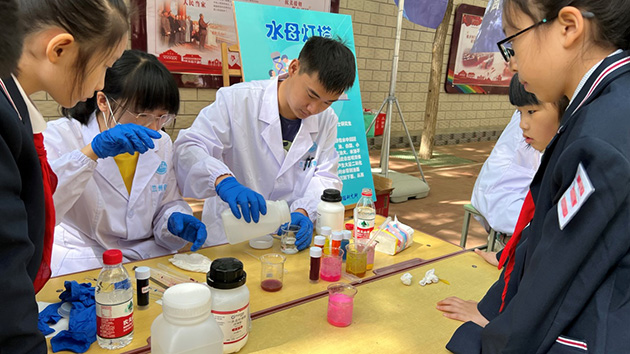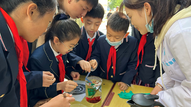 來(lái)自羰基合成與選擇氧化國(guó)家重點(diǎn)實(shí)驗(yàn)室、中國(guó)科學(xué)院西北特色植物資源化學(xué)重點(diǎn)實(shí)驗(yàn)室、先進(jìn)潤(rùn)滑與防護(hù)材料研究發(fā)展中心、環(huán)境材料與生態(tài)化學(xué)研究發(fā)展中心的8名研究生,開(kāi)展了“水母燈塔”“大象牙膏”“看我七十二變”“水下花園”等4組實(shí)驗(yàn)?;顒?dòng)中,科普實(shí)驗(yàn)員們帶領(lǐng)學(xué)生們學(xué)習(xí)了簡(jiǎn)單實(shí)用的科學(xué)知識(shí),展示了精彩有趣的科學(xué)實(shí)驗(yàn),引導(dǎo)學(xué)生們自主動(dòng)手感受科學(xué)實(shí)驗(yàn)的快樂(lè)。小實(shí)驗(yàn)蘊(yùn)含大智慧,科學(xué)實(shí)驗(yàn)的神奇魔力讓同學(xué)們目不轉(zhuǎn)睛。