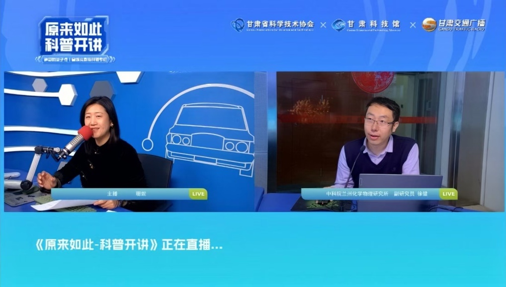 12月13日,中國(guó)科學(xué)院蘭州化學(xué)物理研究所徐健副研究員受邀在甘肅交通廣播《原來如此—科普開講》欄目開展了線上直播科普講座。