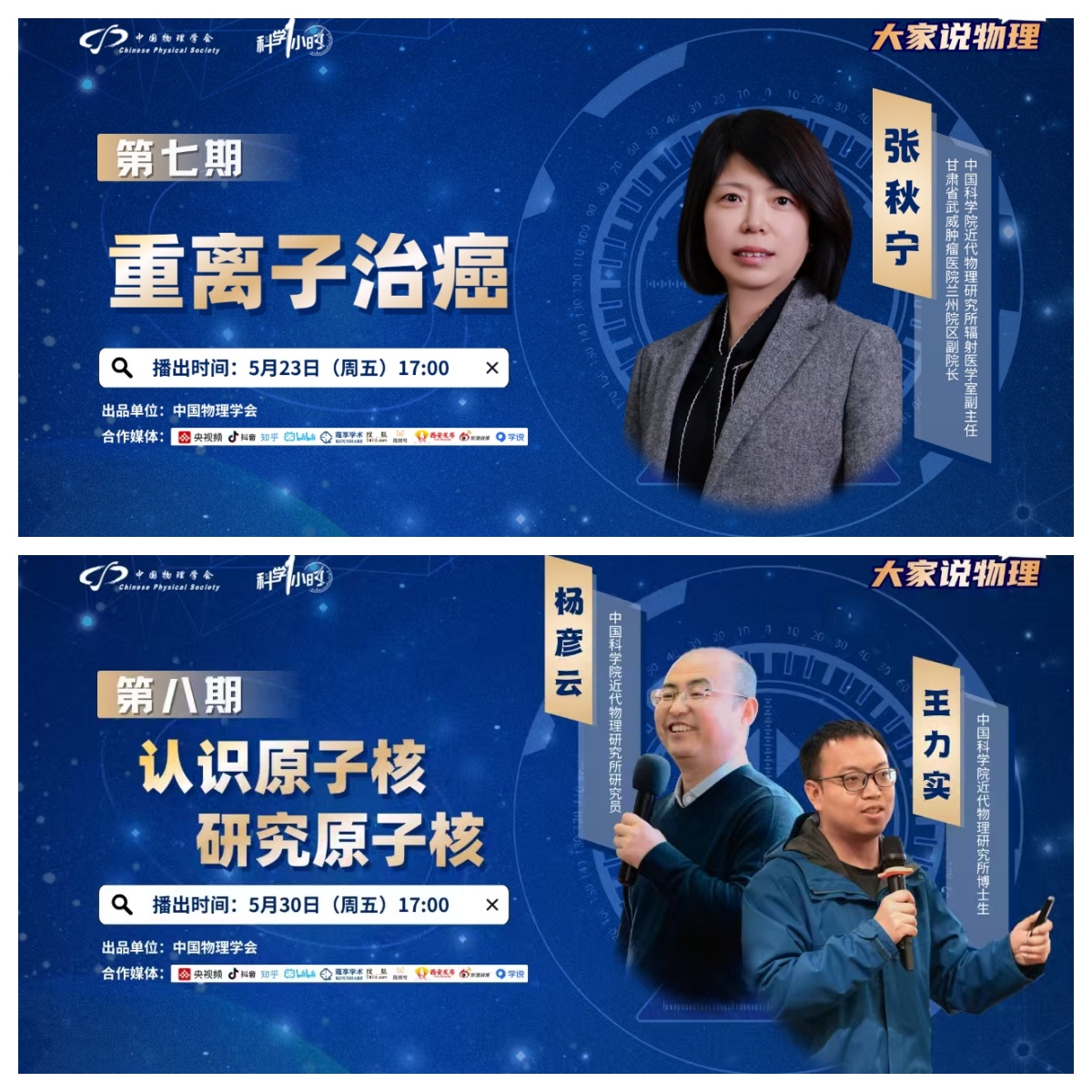 在全國科技周期間,受中國物理學(xué)會邀請,近代物理所張秋寧研究員、楊彥云研究員及王力實(shí)博士共同參與了“科學(xué)一小時(shí)”科普欄目的錄制,開展了題為《重離子治癌》和《認(rèn)識原子核,研究原子核》的線上科普課程。