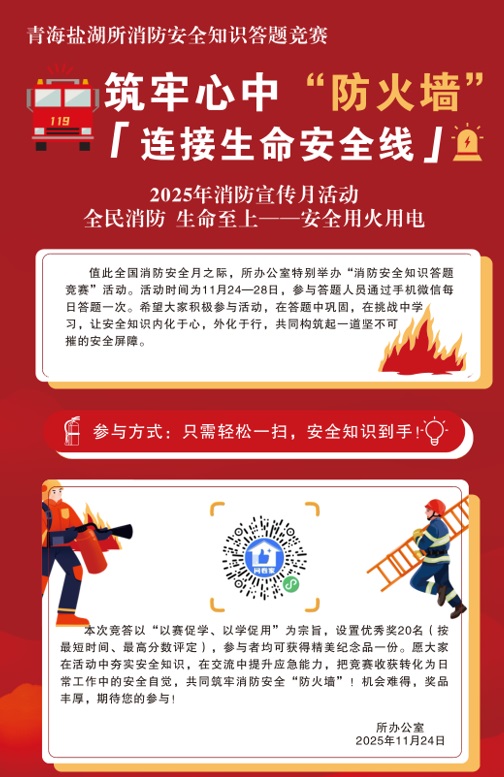 為切實(shí)筑牢消防安全防線,提升全員消防安全意識(shí)和應(yīng)急處置能力,在全國(guó)消防月期間,中國(guó)科學(xué)院青海鹽湖研究所創(chuàng)新消防安全教育形式,于11月24日至28日組織開展了線上消防安全知識(shí)競(jìng)答活動(dòng),全所100余名職工及學(xué)生通過掃描二維碼參與活動(dòng),以賽促學(xué)、以學(xué)促用,營(yíng)造了濃厚的消防安全學(xué)習(xí)氛圍。
